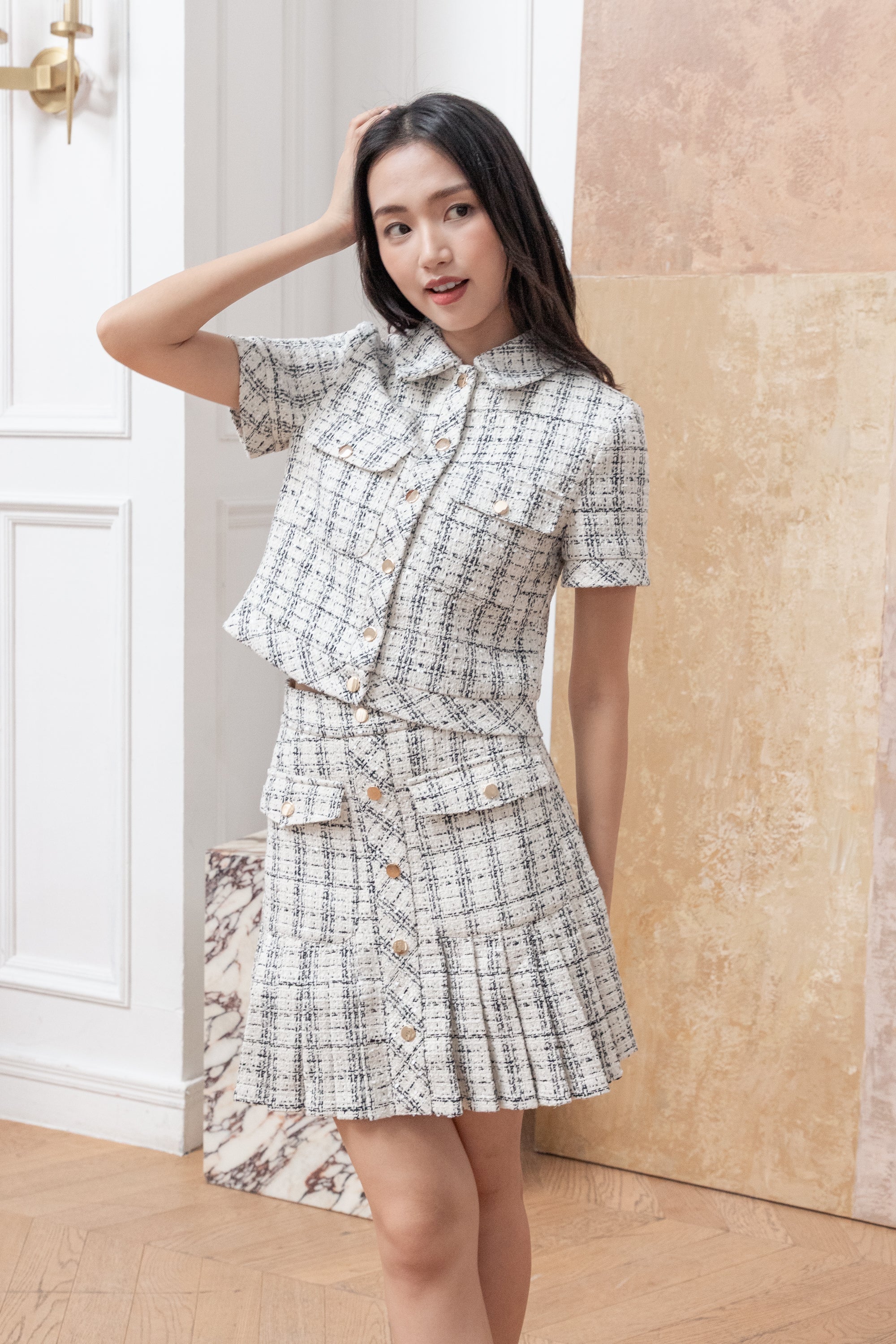 Fallon check pleated tweed skirt